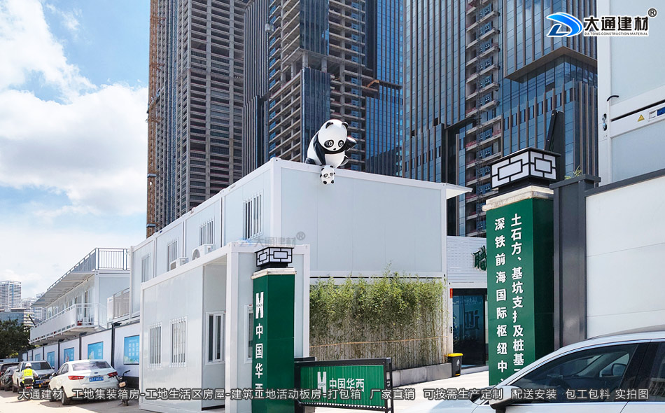 在深鐵前海國際樞紐中心T7土石方、基坑支護及樁基工程項目的工地生活區房屋,選用的是深圳市大通建材生產銷售的工地集裝箱房。此項目工程的工地生活區箱房最基礎的,是作為工人宿舍使用。經過改造的集裝箱房,內部配備上下鋪床位,安裝了門窗、照明設施和通風設備,有的還配備了空調。原本冰冷的鋼鐵箱體,被劃分成一個個溫馨的居住單元,為辛苦勞作一天的工人提供遮風擋雨、休息安睡的場所,同時配有廚房、雜物間、洗手間等。為了提升居住體驗,此工地還在集裝箱房外搭建遮陽棚、洗漱區等配套設施,讓工人在忙碌的工作之余感受到生活的便利。